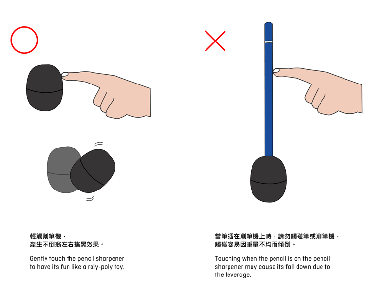 圓潤的扭蛋造型,上殼為一體成型的鋁材質削筆機,底座利用鑄鋅的重感,形成搖晃不倒翁的樂趣。除了削筆機及筆插之外,也是桌面上療癒的物件。